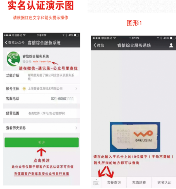 使用繁睿2G流量卡,無限流量卡實名認證:首先在微信里面關注睿信綜合服務系統公眾號。